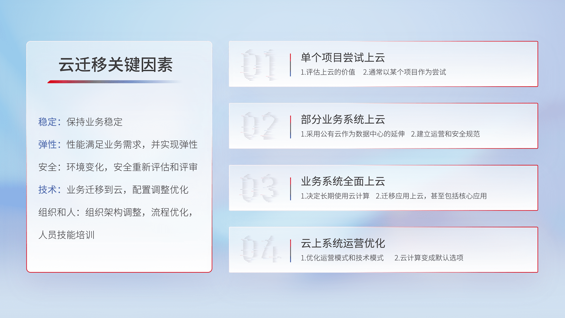 结合实际业务,,,从规划设计、、云平台选型、、、云原生改造、、、、数据迁移、、集成交付,,,,迁移全过程为客户识别最佳上云路径,,,,做好风险识别管理,,,,设计网络架构、、、身份权限、、安全审计合规、、、、操作审计、、日志审计、、、监控告警策略、、、、多站点容灾设计等,,对云上基础设施进行整体规划,,,,提升IT治理水平,,,以满足弹性、、高可用、、、、高性能的需求。。。。