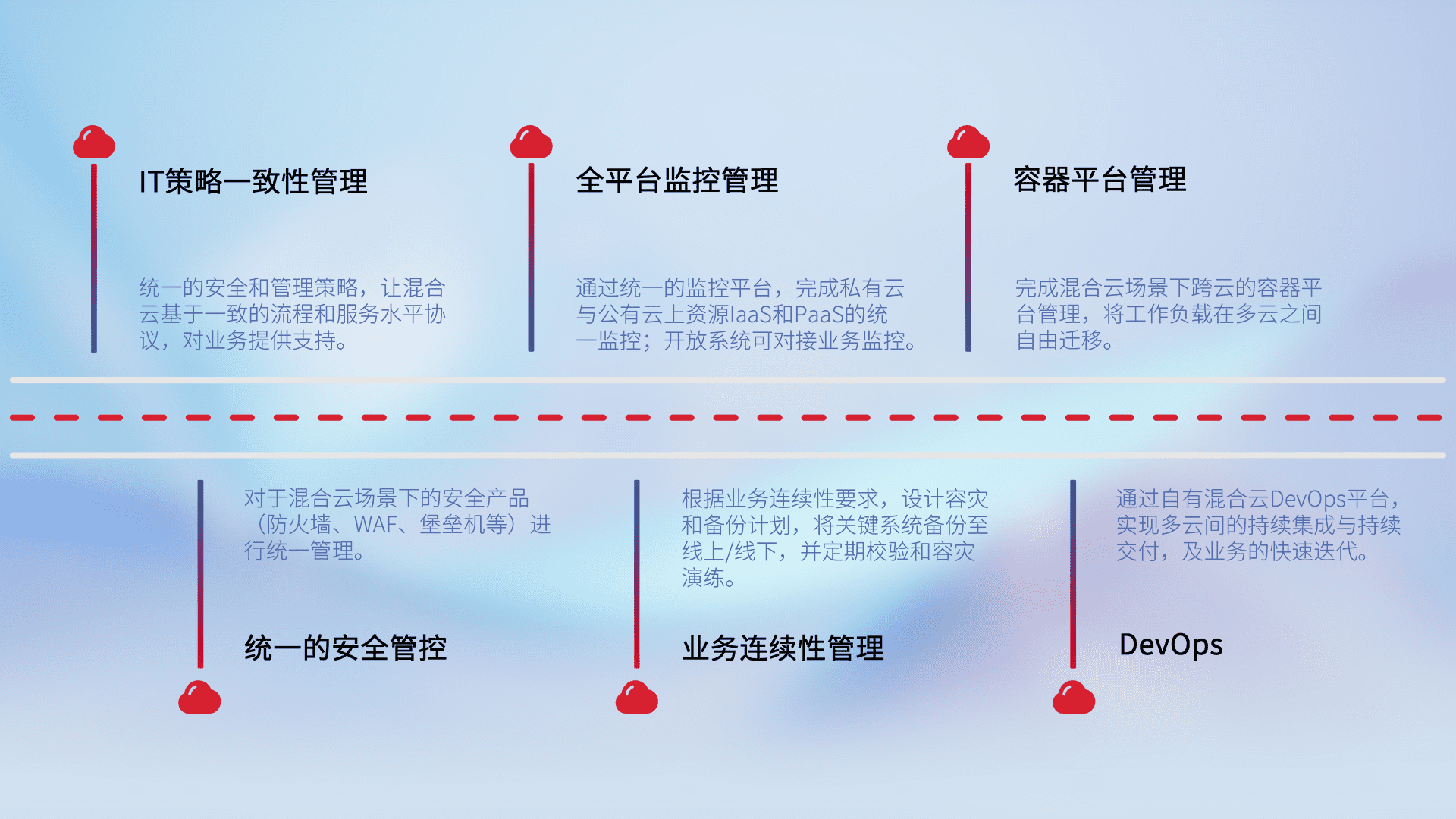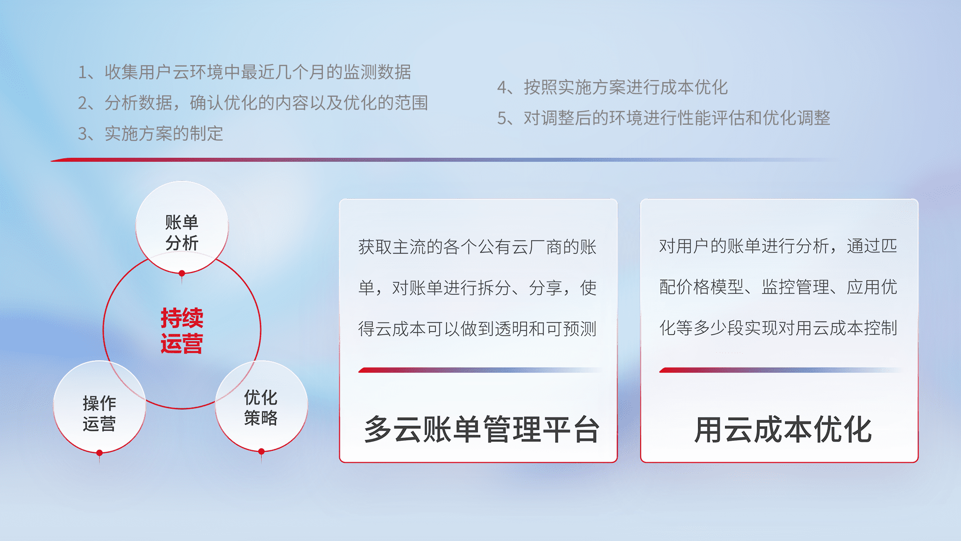 通过多云纳管,,,,以统一的资源数据模型把客户的云资源进行抽象和封装,,,进而实现对多云资源的统一操作,,,保障云资源管理的可靠性、、稳定性与可用性。。。。量身定制化运维内容,,,配置、、、、开发运维、、、、补丁管理、、备份、、监控、、认证和访问管理、、、审计和日常巡检等,,,保障在用云过程中的可靠度,,,,稳定度以及高可用率。。
